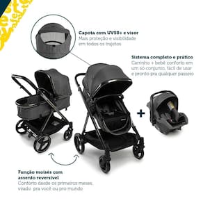 Especificações Técnicas: Tipo: Carrinho e bebê conforto travel system Fechamento: Tipo envelope Capota: UV50+ com visor Assento: Converte em moisés e é reversível Cinto de Segurança: 5 pontos com ajuste e protetores acolchoados Rodas: Suspensão dianteira e traseira para condução suave Peso do Produto: 11 kg (carrinho) / 3,5 kg (bebê conforto) Dimensões do Carrinho: 87 x 57 x 106 cm Dimensões do Bebê Conforto: 63 x 43 x 55 cm Certificação INMETRO: Normas de Segurança ABNT NBR 14.389 para até 15 kg Garantia do fornecedor: 12 meses.