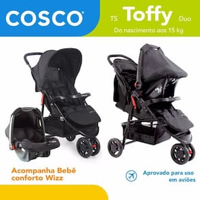 Para pais que querem conforto e modernidade, o conjunto TS Toffy Duo da Cosco, para uso desde o nascimento, possui inclinação em múltiplas posições e ajuste do apoio dos pés, trazendo um formato aconchegante para os recém-nascidos e vai acompanhando o crescimento da criança, ajustando-se para o dia a dia e todos os passeios da família.Confortável, o colchonete super acolchoado e macio pode ser removido quando for necessário lavar. A capota é ampla e com visor protegido por tela para ver o bebê durante o passeio. A manopla com formato inteiriço tem revestimento macio, aumentando o conforto para os pais. A roda dianteira dupla tem giro 360 para dirigir com facilidade e trava de movimento, além do freio nas rodas traseiras com acionamento único. Segurança garantida com cintos de 5 pontos para a criança, ajustáveis em altura e largura. Leve o que precisar: bolso para pequenos objetos na capota e amplo cesto inferior, com capacidade para até 5 kg. Fechamento rápido e fácil, é leve para armazenar ou transportar.Acompanha adaptadores e o Bebê Conforto Wizz, com estrutura leve que facilita para carregar e para instalar no veículo, almofada redutora para os recém-nascidos e capota removível para proteger seu bebê. Alça com 4 posições e 5 modos de uso (Axo, balanço, carregar e instalar no carro ou carrinho), cinto de segurança de 3 pontos com protetores de ombros, 2 posições de altura e ajuste centralizado com botão frontal. A capa é lavável na máquina.Carrinho aprovado pelo INMETRO conforme a norma ABNT NBR 14.389 para crianças do nascimento aos 15kg. Bebê conforto aprovado pelo INMETRO conforme a norma ABNT NBR 14.400 para crianças do nascimento aos 13kg (Grupo 0+).