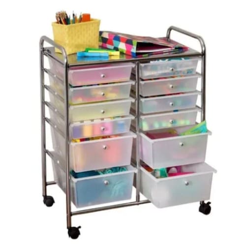 Este organizador com rodas possui 12 gavetas de fácil acesso.