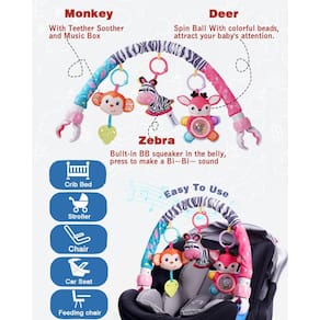 Brinquedos para Berço Você pode montá-lo facilmente em diferentes carrinhos de bebê, assento de carro, carrinho, berço, berço e balanços. Brinquedos de pendurar para bebês aplicação para a largura: 11,6 – 20,2 polegadas/29,5 – 51,3 cm. - Brinquedos de assento de carro para bebês de 0 a 6 meses, os brinquedos para carrinho de bebê têm três animais, macaco com mordedor e caixa de música. Boca na barriga de zebra, pressione para fazer um som de Bi~ Bi~. Os cervos têm bolas giratórias com contas coloridas, atraindo a atenção do seu bebê. - Brinquedos de assento de carro, é um brinquedo de desenvolvimento inicial. Brinquedos de berço pendurados feitos de materiais laváveis. Cada brinquedo de carrinho de bebê pode ser montado e jogado separadamente. - O móbile do bebê para berço é fácil de usar. O berço tem duas formas de alongamento e arco. Você pode facilmente montá-lo em diferentes carrinhos de bebê, assento de carro, carrinho, berço, berço e balanços. Brinquedos de pendurar para bebês aplicação para a largura: 11,6 – 20,2 polegadas/29,5 – 51 cm. - Brinquedos de carrinho que acompanham o bebê dia e noite. Pode ouvir o desenvolvimento da visão, desenvolvimento das mãos, imaginação e criatividade. O brinquedo do arco do carrinho pode ser "naturalmente" confortável, em casa ou em movimento. - 100% SATISFAÇÃO se você não estiver satisfeito, prometemos que faremos o certo para você.