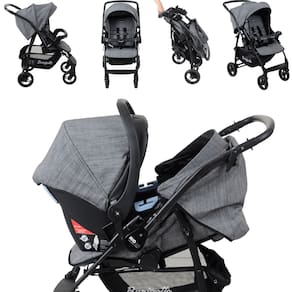 O carrinho possui cinto de 5 pontos, protetor frontal removível e freio manual na manopla, oferecendo controle total ao responsável. As rodas dianteiras giratórias com travas garantem estabilidade, e o cesto porta-objetos facilita o transporte de bolsas e brinquedos. O ninho Pramette acolhe o recém-nascido com conforto e segurança, enquanto o bebê conforto Materna, com a base ISOFIX, garante viagens seguras e tranquilas para toda a família.