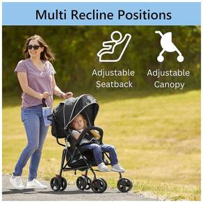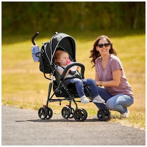 Componentes Incluídos: Cinto de segurança de 5 pontos, rodas dianteiras giratórias, freios nas rodas traseiras, capota de tamanho completo com viseira solar retrátil, capa de assento removível, cesto de armazenamento extra grande, suporte para copo,