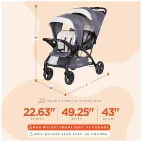 As crianças podem sentar se nos bancos dianteiro e traseiro do carrinho ou ficar na plataforma traseira Assentos de carro compatíveis com tendência para bebês Cor tempestuoso Equipado com um cinto de segurança de 5 pontos para máxima segurança 2 painéis de cobertura totalmente ratcheting no banco da frente e dossel fixo com viseira para proteção solar Suporte compacto com uma mão O banco traseiro removível converte o carrinho no modo de bancada e em pé para facilitar o transporte e o zenamento Dimensões dobradas 55 x 86 x 40 centímetros Bandeja pai coberta com porta copos, compartimento coberto e uma cesta extra grande para zenamento extra Dimensões 55 x 125 x 109 centímetros Marca: Não Informado