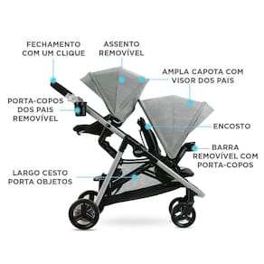Possui uma cesta de armazenamento grande e de fácil acesso com espaço para os itens essenciais do bebê e dos pais. Porta-copos para os pais e uma barra removível com porta-copos para a criança. As capotas fornecem excelente cobertura do sol e do vento e, seu fechamento de única etapa com apenas um clique facilita a dobragem e o armazenamento.