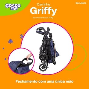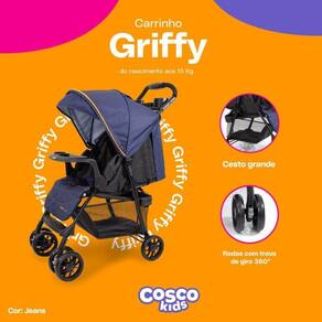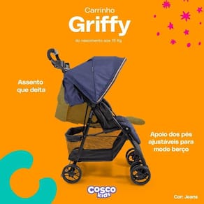 Carrinho de bebê que inclina em diversas posições, capota com UV30+, bandeja para os pais e para a criança e fechamento com uma única mão. Ter um bebezinho e poder levá-lo para todos os lugares com conforto e segurança é o que o Carrinho Griffy da Cosco Kids vai te proporcionar. Um carrinho de bebê modelo berço, com recursos especiais para uso em todos os momentos. O assento é acolchoado e macio e ele sai para lavar quando precisar. O conforto vem com a inclinação em várias posições, sentado até deitado, em conjunto com a possibilidade de elevar o apoio de pés para um modo bercinho na soneca ou abaixá-lo conforme a criança cresce e estiver acordada aproveitando o passeio.As duas bandejas, uma para os pais e outra para o bebê, com porta-copos, pode ser removida conforme a necessidade e facilita a hora do lanchinho ou apoiar algum brinquedo para divertir. O bolso na capota permite deixar de fácil acesso o celular ou carteira para pegar rapidamente se precisar. O cesto é grande e espaçoso para levar a mochilinha ou objetos do bebê como brinquedos ou alguma pequena compra de itens do dia a dia. As quatro rodas dão estabilidade e têm giro total na frente para movimentar e fazer curvas com facilidade e ainda travar se o terreno for irregular. O freio nas rodas de trás garante segurança ao parar o carrinho ou colocar e retirar o seu filho.O cinto de 5 pontos vai crescendo com o bebê, em altura e largura e tem ainda uma proteção fofinha para não machucar. Por isso, não esqueça, use sempre!Completando muito bem toda a proteção e cuidado que seu filho merece, o Griffy tem a capota com proteção solar UV30+, uma aba de sol extra, para quando o sol for baixando e ainda uma janelinha para ficar de olho no bebê, sempre que quiser. Uma coisa superimportante é o momento de fechar o carrinho do bebê. Tem que ser fácil e o Griffy oferece uma trava que permite que, com uma única mão, seja possível destravar: um movimento e rapidinho está tudo pronto! Ah, e lembre-se de prender a trava de transporte na lateral e soltar antes de abrir de novo o carrinho.
