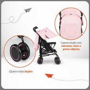Características: Fechamento compacto e rápido: Fechamento estilo guarda-chuva, leve e fácil de transportar, com alça para levar a qualquer lugar. Assento reclinável: Três posições de inclinação, incluindo o modo berço, ajustáveis com uma mão. Capota ampla e extensível: Com visor, aba de sol e bolso porta-objetos, protege o bebê do sol e do vento. Apoio de pés ajustável: Possui cinco ajustes de altura, ideal para acompanhar o crescimento do bebê. Rodas duplas com travas: Estabilidade e controle total, com trava de giro 360 nas rodas dianteiras e freio interligado nas traseiras. Cinto de segurança de 5 pontos: Ajustável em altura e largura, com protetores acolchoados para máxima segurança. Cesto porta-objetos: Capacidade para até 3 kg, perfeito para carregar itens essenciais.