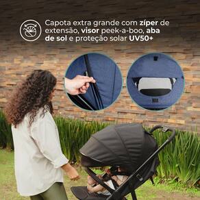 Capota Ultra-Protetora: Extra-grande, com zíper de extensão para maior cobertura e proteção UV50+. Inclui visor peek-a-boo, permitindo acompanhar o bebê durante o passeio.