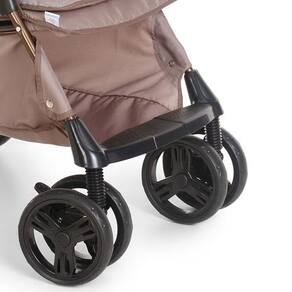 Seu estofamento é acolchoado em tecido removível e lavável com sistema dupla face. Conta, ainda, com protetor de ombro, protetor frontal, 4 rodas dianteiras giratórias com duplo sistema de freios, 2 rodas traseiras fixas com duplo sistema de freios, eixos dianteiros removíveis e capota com teto solar e retrátil para total proteção.