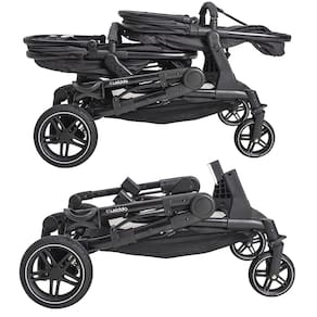 - Capotas retráteis com proteção solar UV FPS 50+, garantindo sombra e segurança nos passeios ao ar livre