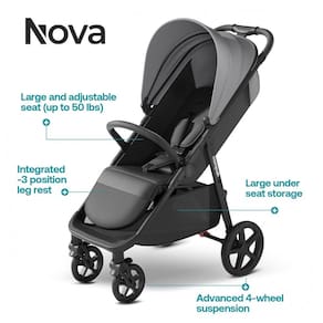 ASSENTO ESPAÇOSO Delicie se com o conforto extra espaçoso, o Nova oferece 20 mais espaço no assento em comparação com os tradicionais carrinhos leves de 4 rodas. Está equipado com um colchão macio e respirável para maior conforto. Adequado desde o nascimento até 50 libras 22,68 kg, cresce com o seu filho.