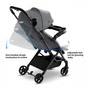 RECLINAÇÃO QUASE PLANA DE 175 Encosto totalmente reclinável e apoio para os pés ajustável, proporcionando um modo deitado que é perfeito para recém nascidos. Encosto reclinável em 3 posições com ajuste fácil com uma mão.
