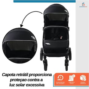 - Fechamento ultra fácil - Bandeja para bebê - Assento com encosto macio e reclinável - Capota retrátil - Cinto de 5 pontos - Estrutura leve - Idade recomendada 0 - 36 meses - Aprovado pelo INMETRO