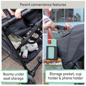 As rodas traseiras medem 35,5 cm, as dianteiras 14 cm, ambas em EVA com sistema de suspensão que proporciona condução suave em diversas superfícies. O carrinho é compatível com diversos modelos de cadeirinhas de automóvel, facilitando a transição entre transporte e passeio. Possui amplo cesto inferior, bolso traseiro e suporte para celular, aumentando a funcionalidade.