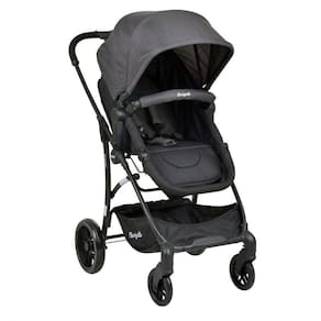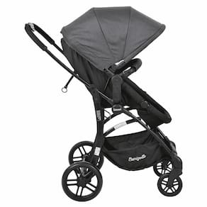 Possui assento reversível, encosto reclinável em múltiplas posições cesto, porta objetos, rodas dianteiras com giratórios, capota regulável e cinto de segurança de 5 pontos.