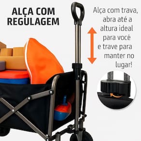 Características: Estrutura de aço robusta garante alta resistência e durabilidade. Tecido impermeável e reforçado com alças protege seus itens da chuva e é fácil de limpar. Alça ergonômica ajustável proporciona mais conforto na hora de puxar. Rodas dianteiras com rotação 360 facilitam a mobilidade em qualquer direção. Rodas traseiras com textura especial perfeitas para terrenos irregulares como areia, grama e pedras. Design dobrável e compacto fácil de guardar no porta-malas ou em pequenos espaços.