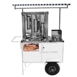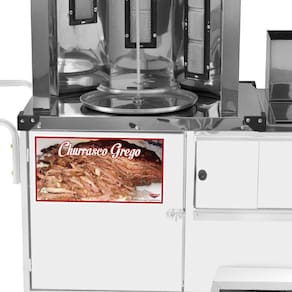 Sua estrutura é fabricada em aço carbono com chapa de aço pintado de branco, sendo o carrinho de excelente qualidade e limpeza super prática contando também com um exclusivo adesivo e toldo para dias ensolados e chuvosos. Seu sistema de rodas pneumáticas permite que o Carrinho seja transportado por qualquer tipo de terreno fazendo com que a sua venda de Churrasco Grego seja conhecido em qualquer lugar.