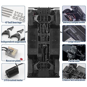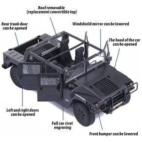 Possui quatro modos de direção, incluindo direção reversa dianteira e traseira, direção dianteira e traseira na mesma direção, direção nas rodas dianteiras e direção nas rodas traseiras. O 112 HMMWV H1 também possui 5 modos de iluminação, incluindo sinais de mudança de direção esquerdo e direito, faróis, luzes de freio, luzes de ré, faróis de neblina, luzes de contorno, etc. Utiliza um motor 370 e 3 servos 9g de direção dianteira e traseira e servo de mudança de marcha, que consomem baixa energia e aceleram rapidamente, permitindo que o veículo atinja uma velocidade de 8km h em estradas lisas.