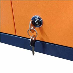 - Possui uma gaveta com corrediças telescópicas de esferas e duas portas com cadeado para fechamento. - Com 4 Rodízios de 3, dois fixos e dois móveis - Maior resistência e durabilidade: tratamento químico antiferrugens, fosfatizante e pintura eletrostática a pó - Bandeja Reforçada - Trava para cadeado - Cor: Cinza com detalhes laranja