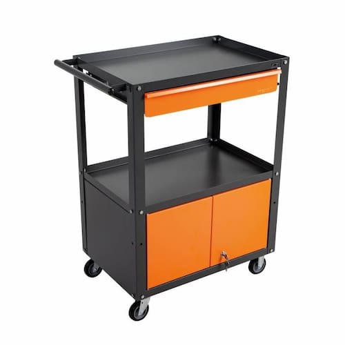 Carrinho de Ferramentas com Gaveta e Armário Atende as necessidades de organização do local de trabalho e ainda transporta e pode ser utilizado como bancada de trabalho. Utilizado nas mais diversas aplicações como oficinas e chão de fábrica para organização de ferramentas e acessórios. O Carrinho é desmontável o que facilita e barateia o transporte. - Possui uma gaveta com corrediças telescópicas de e duas portas com cadeado para fechamento. - Com 4 Rodízios de 3, dois fixos e dois móveis - Maior resistência e durabilidade: tratamento químico antiferrugens, fosfatizante e pintura eletrostática a pó - Bandeja Reforçada - Trava para cadeado - Cor: Cinza com detalhes laranja Profundidade: 600mm + 75mm do cabo Largura: 400mm Altura: 850mm Carga Máxima: 80Kg distribuídos