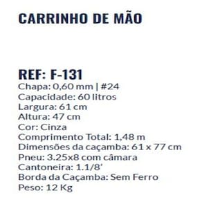 Robusto, prático e durável: o parceiro certo para qualquer trabalho pesado! Acabamento da Caçamba: Pintura Eletrostática Acompanha Câmara de Ar: Sim Altura: 47 cm Altura da Caçamba: 470 mm Ambiente Principal: Comércio Câmara de Ar Indicada: 3.25x8 Capacidade da Caçamba (Material Líquido): 60 l Capacidade da Caçamba (Material Seco): 60 l Carga máxima: 200 kg Comprimento: 1.480 cm Comprimento da Caçamba: 770 mm Cor da Caçamba: Cinza Desmontável: Não Diâmetro da Roda: 8 in Espessura da Chapa da Caçamba: 0,6 mm Formato Frontal da Caçamba: Quadrado Indicado para: Construção Civil Itens Inclusos: 1 Carrinho de Mão Largura: 61 cm Largura da Caçamba: 610 mm Manual de Montagem e Instalação: https://product-hub-prd.madeiramadeira.com.br/651918312/documents/49fc0b51-5fd7-4c72-a1cb-14e76e0e07da3202370646617579416754833.pdf Marca: Friza Material da Caçamba: Aço Carbono Material do Braço: Ferro Material dos Pés: Ferro Necessita Montagem: Não Origem do Produto: Nacional Peso: 12 kg Possui Pés: Sim Resistência a Risco: Não Resistência Química: Não Suporta Até (kg): 170 kg Tamanho da Caçamba: Funda Marca: Não Informado