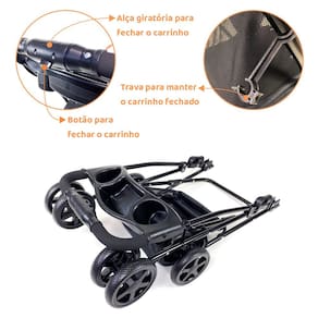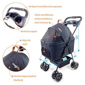 Especificações: * Acompanha manual de instrução; * Dimensões do produto aberto (altura x largura x comprimento): 96 x 45 x 68 cm; * Dimensões do produto fechado (altura x largura x comprimento): 23 x 45 x 84 cm; * Dimensões do berço (altura x largura x comprimento): 47 x 32 x 54 cm; * Quatro rodas frontais de 5,5" com pneus EVA; * Quatro rodas traseiras de 5,5" com pneus EVA; * Peso do carrinho é de 5,8 kg; * Para pets até 15 Kg; * Ideal para cachorros e gatos; * Modelo Pet foi um Lulu da Pomerânia de 9 kg.