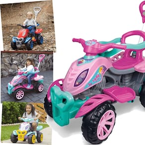 O Quadriciclo é um brinquedo completo, uma ótima escolha que vai marcar a infância do seu bebê! Ele conta ainda com haste direcionável e removível, som, buzina, rodas com anel antiderrapante, assento com encosto anatômico, cercado removível, apoio para os pés removível, suporte para bolsa/sacola na alça da haste e sistema de tração para maior conforto e agilidade ao pedalar.