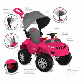 Carrinho de Passeio e Pedal - Superjipe Reclinável com Capota - Rosa - Bandeirante: A sua pequena vai se divertir desde o primeiro ano de vida. O SuperJipe Rosa, da Bandeirante, é um brinquedo 2 em 1 prático e divertido. Um produto com duas funções, prático e moderno para o adulto e divertido para as crianças. O SuperJipe acompanha o crescimento da criança. Este carrinho é inspirado no famoso carro clássico. Estiloso, resistente e seguro, o SuperJipe vem com assoalho removível: converte rapidamente o brinquedo entre as funções PASSEIO e PEDAL. Superjipe - 2 em 1 - Passeio e Pedal: • Função passeio: o adulto conduz o SuperJipe como um carro de passeio • Função pedal: permite à criança brincar livremente como um carro a pedal. Basta remover a haste e o assoalho Detalhes • Painel interativo • Resistente e seguro • Volante com buzina • Freio traseiro de segurança • Haste direcionável e removível • Rodas com anel antiderrapante • Assento reclinável em 3 posições • Capota articulável, retrátil e removível • Suporte para bolsa/ sacola (na alça da haste) • Suporte para garrafa d'água, mamadeira ou squeeze (na haste) • Cinto de segurança removível com prático sistema de abertura lateral Informações: • Produto: SuperJipe - 2 em 1 - Rosa • Marca: Bandeirante Brinquedos • Cor: Rosa • Categoria: Carrinho de Passeio e Pedal • Peso máximo suportado: até 35 kg • Dimensões (C x A x L): 92.5 x 62.5 x 57 cm • Volume (Peso): 8.7 kg • Recomendação: para crianças a partir de 12 meses de idade Especificações: • Referência: 586 • Código de Barras:7899091405862 • Embalagem (C x A x L): 127 x 98 x 64.5 cm • Embalagem (Peso): 9 kg • Material / Composição: Plástico • Registro: CE-BRI/INNAC-00143-01A • Certificado: Órgãos Autorizados - OCP´S (Organismos de Certificação de Produtos) Habilidades desenvolvidas: • Curiosidade e descoberta • Compreensão de causa e efeito • Coordenação entre olhos e pés • Coordenação motora fina - mãos e dedos • Coordenação motora grossa - braços e pernas Aviso: • As imagens são meramente ilustrativas • Os pesos, tamanhos e medidas são aproximados • As cores e estampas dos produtos podem ter variações • As informações são de responsabilidade do fabricante ou fornecedor