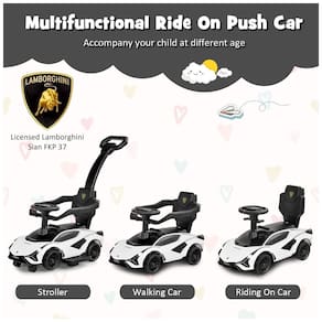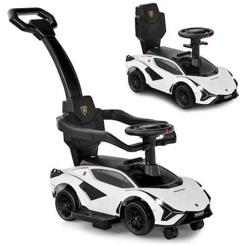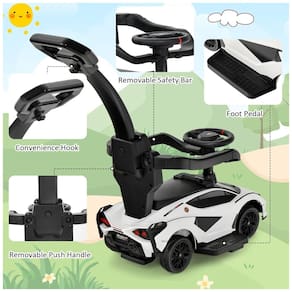 Carro de passeio: o carrinho de bebê INFANS vem com visual. O carrinho de criança é a combinação perfeita de estilo e funcionalidade. Este carro licenciado é o presente perfeito para uma criança. Carro de empurrar conveniente 3 em 1: O carro de passeio 3 em 1 pode ser transformado em carrinho de bebê, carrinho de passeio ou carro de passeio, permitindo que ele cresça com seu filho. O carro tem 2 modos de controle: controle dos pais e controle dos filhos. Além disso, o volante removível é conveniente para a mãe controlar a direção. A segurança é a primeira prioridade: Este carrinho de bebê foi projetado com guarda corpo de segurança removível e apoio para os pés, garantindo a segurança do seu filho durante os passeios. Além disso, dispositivos anti queda e pneus resistentes ao desgaste melhoram a estabilidade geral e evitam efetivamente tombamento. Ele pode suportar até 24 kg. Experiência de direção real: O carro deslizante possui um volante confortável, efeitos sonoros que imitam os sons de um motor real. Isso permite que seu filho sinta que está no controle de seu próprio veículo. Nota: 4 pilhas AA de 1,5 V não incluídas. Várias funções aplicáveis: O carrinho ambulante vem com um gancho conveniente, que pode transportar copos de água e sacolas infantis. Um espaço de zenamento escondido sob o assento para pequenos itens, como lanches e brinquedos. Além disso, o painel de controle possui um display de energia.