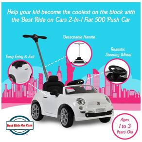 O carro de empurrar Fiat 500 licenciado vem com carrinho de passeio, apoio para os pés ajustável, alça ajustável, buzina e música, portas abertas Marca: Não Informado