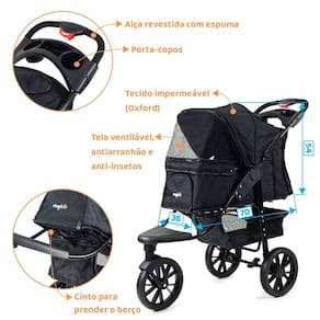 Especificações: * Acompanha manual de instrução; * Dimensões do produto aberto (altura x largura x comprimento): 108 x 57 x 115 cm; * Dimensões do produto fechado (altura x largura x comprimento): 44 x 57 x 99 cm; * Dimensões do berço (altura x largura x comprimento): 54 x 36 x 70 cm; * Uma roda frontal de 11" com pneus EVA; * Duas rodas traseiras de 11" com pneus EVA; * Peso do carrinho é de 9,2 kg; * Para pets até 25 Kg; * Ideal para cachorros e gatos; * Modelo Pet foi um sem raça definida de 18 kg.
