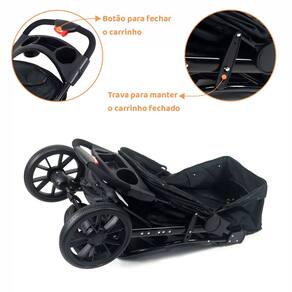 Possui estrutura de aço, tecido impermeável, telas antiarranhões e anti-insetos, alça revestida com espuma, porta-objetos, porta-copos, berço com teto articulado, porta traseira, cortina frontal e superior, dois cintos de segurança, colchonete e fundo rígido.