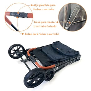 Possui estrutura de aço, alça revestida com couro sintético, berço em tecido impermeável, telas antiarranhões e anti-insetos, bancada que pode ser removida, bolso traseiro e nas duas laterais, cortina frontal e superior, abertura frontal, superior e traseira, dois cintos de segurança, colchonete com fundo rígido.