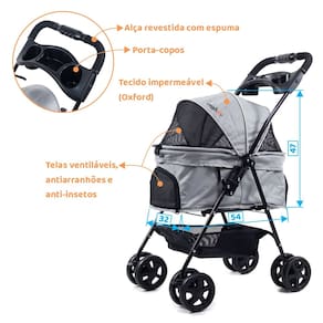 Especificações: * Manual de instrução em português; * Dimensões do produto aberto (altura x largura x comprimento): 96 x 45 x 68 cm; * Dimensões do produto fechado (altura x largura x comprimento): 23 x 45 x 84 cm; * Dimensões do berço (altura x largura x comprimento): 47 x 32 x 54 cm; * Ideal para cachorro e gato; * Peso suportado até 15 Kg; * Simples de dobrar e fácil armazenamento para uso diário; * Alça revestida com espuma; * Fundo do berço rígido e com almofada confortável e removível; * Dois cintos de segurança para serem presos na coleira do seu animal de estimação; * Teto do berço articulado, com trava e em tecido perfurado para circulação do ar e visualização; * Amplo porta-suprimentos e objetos; * Porta-copos; * Quatro rodas frontais de 5,5", material EVA e 360° giratórias; * Quatro rodas traseiras de 5,5", material EVA e com freio; * Estrutura de aço; * Tecido impermeável (Oxford).
