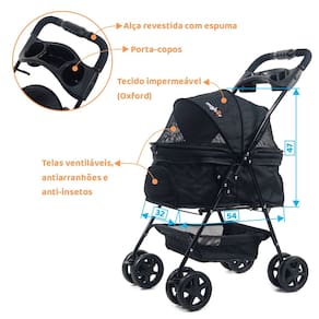 Especificações: * Acompanha manual de instrução; * Dimensões do produto aberto (altura x largura x comprimento): 96 x 45 x 68 cm; * Dimensões do produto fechado (altura x largura x comprimento): 23 x 45 x 84 cm; * Dimensões do berço (altura x largura x comprimento): 47 x 32 x 54 cm; * Quatro rodas frontais de 5,5" com pneus EVA; * Quatro rodas traseiras de 5,5" com pneus EVA; * Peso do carrinho é de 4,9 kg; * Para pets até 15 Kg; * Ideal para cachorros e gatos; * Modelo Pet foi um Lulu da Pomerânia de 9 kg.