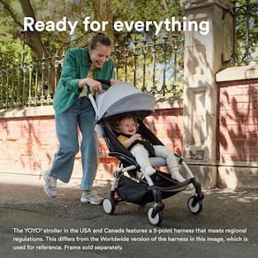 - Isenção de responsabilidade: o carrinho YOYO3 nos EUA e Canadá possui um arnês de 5 pontos que atende aos regulamentos regionais. Isso difere da versão mundial do arnês nesta imagem, que é usada para referência.
