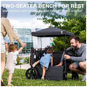 Os assentos acolchoados e os arneses ajustáveis em 3 posições garantem conforto excepcional aos pequenos passageiros. O amplo espaço de carga de 78 x 40 cm permite que as crianças se estiquem durante o passeio, proporcionando uma experiência mais agradável.