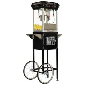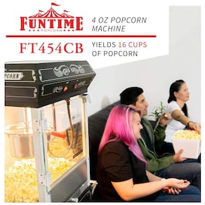 A máquina Funtime apresenta uma chaleira de óleo quente em aço inoxidável com um sistema de agitação integrado e uma tampa articulada para que a pipoca saia enquanto estoura. Além disso, possui um coletor de kernel removível que separa os grãos não estourados da pipoca. Com um design fácil de limpar, é construída para estourar grandes quantidades de pipoca estilo teatro A chaleira tem capacidade de 0,14 gramas e aquece rapidamente, dispersando o calor uniformemente para maximizar a quantidade de grãos estourados. O conjunto de tampa de movimento livre permite que o milho estourado saia facilmente da chaleira por conta própria. Com dimensões de 49,53 cm x 43,18 cm x 86,36 cm, possui painéis laterais de vidro temperado de segurança, construção totalmente em metal de qualidade, luz aquecedora embutida e compartimento de armazenamento prático na base do carrinho.
