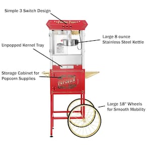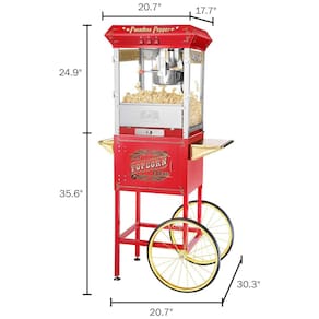 A GNP vende pipocas de qualidade superior para uso doméstico há mais de 10 anos, usando apenas os melhores materiais. Esta pipoqueira elétrica possui zonas de vidro temperado para segurança e uma poderosa chaleira de aço inoxidável de 850 watts. Os materiais utilizados são Vidro Temperado, Aço Inoxidável e Metal. As dimensões são 77 x 50 x 152 cm, Peso 27,17 Quilos. A máquina possui 850 W e 120 V, além de uma luz de aquecimento de 60W. O produto inclui copos medidores, colher, 100 sacos de pipoca e 3 baldes de pipoca. A cor do produto é vermelha.