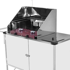 Esse Carrinho é fabricado com estrutura em aço carbono e chapa de aço pintada de branco, acompanha 3 canecas pequenas para qualquer tipo de recheio e fogão 2 bocas baixa pressão indo pronto para o uso. Além disso acompanha adesivo e toldo para dias chuvosos e ensolarados.