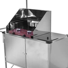 Esse Carrinho é fabricado com estrutura em aço carbono e chapa de inox 430, acompanha 3 canecas pequenas para qualquer tipo de recheio e fogão 2 bocas baixa pressão indo pronto para o uso. Além disso acompanha adesivo, toldo para dias chuvosos e ensolarados e sistema de rodas pneumáticas que permitem o Carrinho ser transportado por ruas, calçadas, paralelepípedos ou até mesmo na praia.