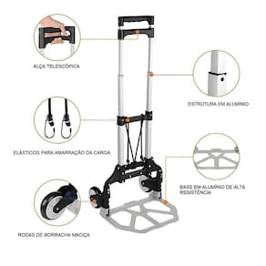 Este carrinho é resistente a cargas pesadas?Sim, é fabricado em alumínio de alta resistência e suporta até 80Kg de carrinho é fácil de armazenar?Sim, é dobrável e compacto, medindo apenas 60 cm de altura quando é o material das rodas?As rodas são emborrachadas, garantindo estabilidade e em qualquer superfí alça é ajustável?Sim, a alça telescópica se estende até 1 metro de altura, proporcionando conforto no carrinho é fácil de usar?Sim, é muito prático de abrir, usar e fechar, ideal para diversas situações do dia a é o peso do carrinho?O carrinho pesa 3,2 Kg, sendo leve e fácil de transportar.