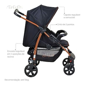 Este lindo conjunto travel da Burigotto é composto por Carrinho + bebê conforto. Prático, seguro e com design moderno, ele é indicado desde recém nascido até crianças de 15kg. Seu encosto é reclinável em 4 posições e seu bebê poderá dormir confortável. Tranquilidade para os pais e conforto para o bebê!