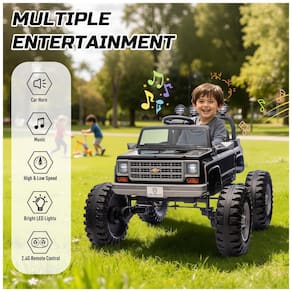 O carrinho elétrico licenciado Chevrolet Cheyenne 24V da MUKIDY é uma réplica fiel em escala real, apresentando design vintage com detalhes realistas como sons autênticos de motor e assento extra largo de 20 polegadas, ideal para acomodar duas crianças pequenas confortavelmente. Equipado com dois motores de 200W, oferece potência total de 400W para desempenho robusto em variados terrenos, possibilitando velocidades de até 5.9 mph com bateria recarregável de 24V que garante 1 a 2 horas de diversão contínua.