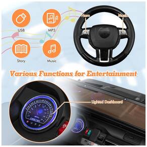 Possui assento duplo de 20" (50 cm) com cintos de segurança de 3 pontos, adequado para até 2 crianças (3 a 8 anos) ou uma criança maior, respeitando o limite máximo de 50 kg. Inclui controle remoto (2,4Ghz) para supervisão parental, com 3 velocidades, função de frenagem instantânea e modo de controle total. O painel multimídia entrega som via MP3, USB, modo rádio, conexão auxiliar e botões interativos no volante (buzina e música).