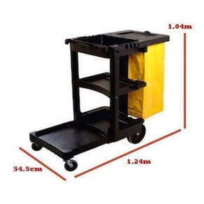 Super resistente, é fabricado em pp polipropileno . O saco em lona que fica na parte traseira possui abertura através de zíper, onde pode ser acomodado sacos de lixo, luvas, panos e produtos para higiene e limpeza. Também possui prateleiras para que seja colocado os acessórios como placa de sinalização de limpeza, pá e mops entre outros.