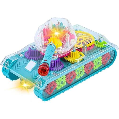 Esse carrinho tanque também emite sons realistas de tanque de guerra, estimulando a criatividade e a imaginação das crianças. A estrutura transparente permite que elas vejam as engrenagens coloridas em ação, estimulando o aprendizado sensorial.