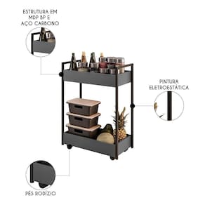 SupplierSimpleName: Carrinho Gourmet de Apoio Industrial 2 Prateleiras Sara M24 GrafitePreto - Mpozenato | Model: Sara | ProductHeight: 94 | Peso: 16 kg | Marca: Mpozenato | Altura: 94 cm | ColorSimple: Grafite | ProductWeight: 16 | ColorSupplier: Grafite | Largura: 70 cm | ProductWarranty: 90 dias após o do produto | SizeDescription: 94 x 70 x 35 cm | OriginState: PR | Requere montagem: Sim | ProductWidth: 70 | ProductInstructions: Produto para uso em ambiente interno, nao devendo ficar exposto ao sol, calor e umidade excessivos. | OriginCountry: | AssemblyRequired: Sim, sugerimos a contratação do nosso de montagem (para os CEPs em que o está dispon | Peso Suportado: 25 Kg | ColorFamily: Grafite | Color: Grafite | ProductContents: 1 Carrinho Gourmet | Manual: Sim | ProductLength: 35 | Profundidade: 35 cm | Tipo de Garantia: Fabricante | Gênero: Unisex | MaterialFamily: MDP | Cor: GrafitePreto | Material: MDP | Origem: