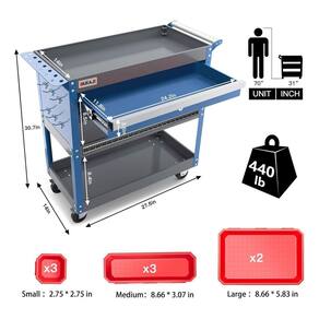 Carrinho de ferramentas AIRAJ fabricado em aço laminado a frio, altamente resistente e com pintura em pó para proteção contra ferrugem e desgaste. Suporta até 200 kg de carga. Possui 4 rodas de borracha com trava para maior estabilidade, gavetas com tapetes antiderrapantes que reduzem ruído, três níveis com painéis perfurados e 10 ganchos removíveis para ampliar o armazenamento. Acompanha divisórias organizadoras e manual de montagem. Ideal para oficinas, fábricas, armazéns e uso doméstico.