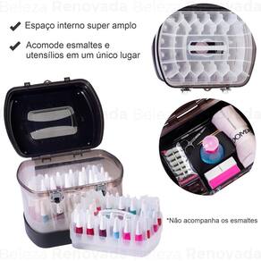 Fabricado em polímero injetado de alta resistência, conta com dois nichos destinados ao armazenamento de esmaltes. A tampa possui encaixe para cadeado e travas em aço, oferecendo maior segurança aos itens armazenados. O modelo dispõe ainda de alça para transporte e compartimento interno com capacidade para acomodar até 68 esmaltes. Acompanha suporte para acetona de 150 ml.