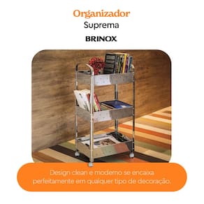 Carrinho Organizador Brinox Suprema Aço Inox – Design, Praticidade e Versatilidade para sua CasaO Carrinho Organizador Brinox Suprema é a solução perfeita para quem busca funcionalidade aliada a um toque moderno na decoração. Fabricado em aço inox resistente, esse carrinho une durabilidade, praticidade e estilo, ideal para diferentes ambientes como cozinha, banheiro, sala ou quarto.Com três prateleiras espaçosas que suportam até 50 kg, você pode organizar utensílios, produtos de higiene, alimentos, livros ou objetos decorativos com eficiência e segurança. Suas rodinhas giratórias facilitam o transporte e permitem que você mude o carrinho de lugar com facilidade, adaptando-se às necessidades do dia a dia.Com dimensões de 43X13,5X57 cm, o carrinho inox Brinox é compacto, mas oferece excelente aproveitamento de espaço. O design clean e moderno se encaixa perfeitamente em qualquer tipo de decoração, do clássico ao contemporâneo.